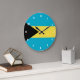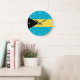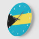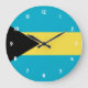 The flag of the Bahamas features a black equilateral triangle on the left representing the unity and determination of the people of the Bahamas. The triangle is oriented toward three equal-width stripes symbolizing areas of natural resource; two aquamarine stripes at the top and bottom of the flag representing the sea and one gold stripe representing the land. The flag was adopted on July 10, 1973.