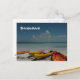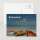 This postcard features a photo of colorful kayaks resting on the a white sand beach with miles of blue water beyond.