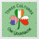 Shamrock features a different flag in each leaf. The flags of Bahrain, Ireland and the United States of America are found in this shamrock, designed to celebrate St. Patrick's Day, 4th of July and Bahraini holidays. The background is of light green squiggly squares. Above the shamrock are the words THREE CULTURES. Below, ONE YOURNAME. Words are in dark green, Celtic style, circular letters. To personalize, add your name in the proper place. For a custom gift, add someone else's name.