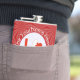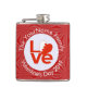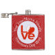 The Bahraini LOVE FLAG shows here on a hip flask. The design shows the word LOVE in red letters inside a white, fractal circle of squiggly squares. The circle sits on a red, fractal background, also of squiggly squares. Perfect gift for your man on for Valentine's Day, but can be customized for any occasion.