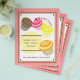 A bake sale flyer featuring an illustration of four cupcakes; chocolate, raspberry, lemon, and orange. Personalize with details of your event.