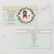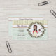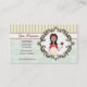 The Baker or Pastry Chef Business Card is a customizable business card with a feminine touch. Perfect to use for a personal business or a business with a physical location. This card can be customized to use for your needs. The illustration features a baker/pastry chef with a yellow apron with hearts on it, a red dress with polka dots, a red head band, and a large cupcake with chocolate frosting designed exclusively by © Cicely James for CiJa Studio. The front background is a pink damask bottom with a yellow and green striped top. The back has a list of menu items and website information for business promotion. The writing is a script font in a feminine chocolate color. Perfect for a professional look with a feminine touch.. Use the personalize feature to the right of the business card demo if you love the font style, coloring and size to just change the demonstration information. If you want to add more text boxes, change the font color, sizing or style--- click on the orange "customize it" button below the business card demo to change things to suit your personal tastes.