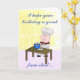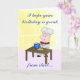 This cute card has my cartoon drawing of a chef mixing up a cake and putting batter in a pan on the front. On the inside is my drawing of a finished birthday cake with candle. The front of the card says, "I hope your birthday is great from start ..." the inside says, "to finish." You can edit all of the text.