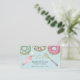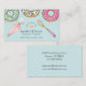 A very whimsical colorful business card for a baker, pastry chef, dessert caterer in pinks, greens, and a pastel blue background with a sprinkle of gold stars and a little pink heart baked with love.