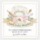 Watercolor baker pastry chef business card featuring a name and title banner and bakers tools\ and chef hat with floral touches and a gold border. Whimsical illustrative style.