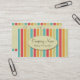These colourful business cards were made with a bakery or pastry chef in mind! They featured a textured background of pink, cream, blue, orange & green stripes. A cream circle contains room for your company name & a tagline (or your website). The back contains room for your name, job title and contact details.