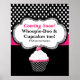 Whimsical cup cake bakery business poster done in black and white polka dots, with graphics of a cupcake with a pink cherry on top. Personalize the text fields to suit your business needs.