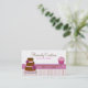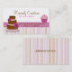 Pretty bakery business card done with graphic artwork of a whimsical pink, brown, and white striped pattern, on the bottom and back of the card. A cartoon pink cupcake and layer cake decorate the front of the card. Personalize the text for your bakery business. Great for at home bakers too. A slightly different version is available with a tad lighter colors, see link below.