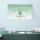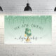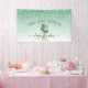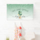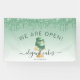 Let customers know your bakery or cake decorating shop is open for business with this elegant banner, featuring a mint green and silver wedding cake illustration on a green ombre background, with a top border of green dripping faux glitter. The words "WE ARE OPEN!" (or text of your choice) arch above the cake in large dark green sans serif font. Customize the sign with your business name in black handwriting script with swashes at the beginning and end, and your contact information or tag line in black sans serif font. (To keep the swashes, replace only the letters in those text fields, leaving the symbols in place.)