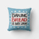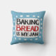 "Baking Bread Is My Jam" is a cute text design in blue with black and red text, along with a white accent shape and white textured whimsical dots surrounding it.