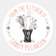Cute line drawn baking or kitchen utensils - rolling pin, whisk, and measuring spoons - in a vase with scattered flowers on these "from the kitchen of" stickers or "homemade by" labels for your gifts or sales of foods, sweets, and treats, personalized with your choice of color scheme, text and fonts.