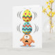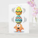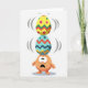 This greeting card features a small, round, peach-toned creature at the center, balancing two decorated eggs with a nervous, wide-eyed look that feels like it’s trying to impress a close friend. Its mouth hangs open in surprise, and the tiny body leans slightly as if bracing for a wobble. The lower egg is light blue with zigzag lines in red, deep blue, and sunny yellow, arranged in neat bands that wrap around the shape. On top sits a bright yellow egg dotted with pink circles and accented by zigzags in red and green, giving the stack an energetic, festive look 🐰. Thin gray curved lines on either side of the eggs suggest shaking, as though the creature is holding its breath while keeping everything steady. Any greeting text appears near the top in a soft, light gray tone, leaving plenty of open space around the illustration 🌷. The background stays white and uncluttered, with the creature placed directly beneath the tall stack of patterned eggs.