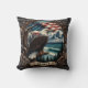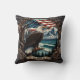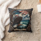 A majestic bald eagle stands on a branch, overlooking waves and mountains, with the American flag softly waving in the background.