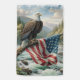 Majestic bald eagle on a tree branch with an American flag suspended over a mountain river