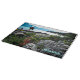 A digital painting of a bald eagle perched on a driftwood log washed up on the rock-strewn coast of Alaska; mountains loom in the distance. Text reading "Alaska" also appears.