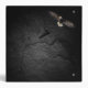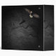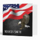 Bald eagle with an American flag on black slate rock background.