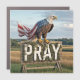 A bald eagle draped in an American flag perches on a rustic wooden sign that reads "PRAY" decorated with green foliage
