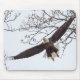 A magnificent bald eagle with wings fully spread as it launches from a tree limb.