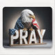 A majestic bald eagle is draped in an American flag, perched above large wooden letters spelling "PRAY."