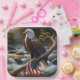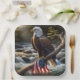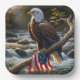 A majestic bald eagle is perched on a sturdy branch over a rocky creek with flowing water with an American flag