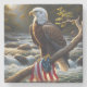 A majestic bald eagle is perched on a sturdy branch over a rocky creek with flowing water with an American flag