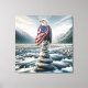 A bald eagle draped in an American flag is perched on top of a stone cairn in the middle of a flowing river surrounded by mountains