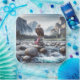 A bald eagle perches on a stone cairn in the middle of a flowing river with a worn American flag draped over the rocks