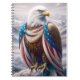 Bald eagle draped in an American flag with a tear in its eye perched on a mountain peak.