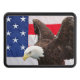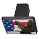 A portrait of a male bald eagle with the american flag. This image was taken of a bald eagle that can't be released into the wild and is used for educational purposes. Photo taken by Debbie Quick of Debs Creative Images. If you like what you see, check out other photographs taken by Debbie at www.debscreativeimages.com