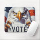 Bald eagle holding a white vote sign with its talons and an American flag is in the background