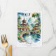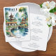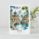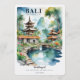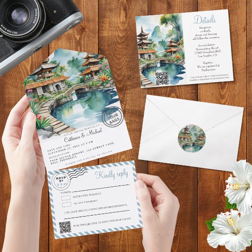 Add an elegant and immersive touch to your reception with this beautifully illustrated menu card inspired by a Bali Indonesia destination wedding. The design features a serene watercolor scene of traditional temple rooftops, lush tropical foliage, and a peaceful garden pond connected by a graceful bridge, creating a calm and romantic island atmosphere.
