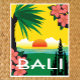 A celebration of Bali Indonesia modeled after the vintage travel style posters of the past. The brightly colored tropical illustration includes a sunset over the ocean, stylized palm tree and frangipani flowers, and a silhouette of a Balinese temple. Original art © Visuaria Publishing.