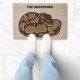 This welcome mat eatures a realistic style illustration of a coiled ball python snake in dark brown and tan. It's ready to be personalized with a name in dark brown lettering. Makes a great gift for pet snake owners.