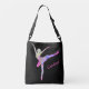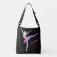Ballet themed all over print tote bag done in black with a colorful silhouette of a lone ballerina. Personalize the pink text, to suit your needs. Great all purpose carry all bag and great for dance class.