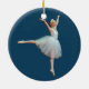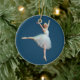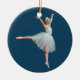 This lovely little ballerina in gorgeous white costume is dancing on a deep blue background. She makes a delightful ornament.