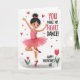 This greeting card shows a smiling young ballerina dancing on one leg in the center. She has dark hair in a top bun with a pink bow, and her face looks bright and happy. She wears a pink leotard with a light, see-through tutu, and her arms are held out with open hands like she’s sharing a hug. Cream-colored socks and reddish-pink ballet slippers finish her outfit, and small red hearts are scattered around the white background. In the upper right, the card says “YOU MAKE MY HEART DANCE!” in big block letters, with words alternating between pink and black. At the bottom, two pink tulips with green stems sit near the message “HAPPY VALENTINE’S DAY,” placed close to one of the flowers. It feels sweet and caring, perfect for sending a little romance or friendship ❤️