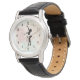 A watch with a silhouette of a ballerina on a pretty background. This elegant ballet dancer is standing on her toes, en pointe with her arms outstretched gracefully. The background is composed of a shabby vintage looking pattern with flower blossoms.