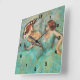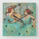 The image of ballet dancers on this stunning wall clock is by the French Impressionist painter Edgar Degas (1834-1917). This image shows two ballet dancers in a turquoise-green color. One is holding a fan.