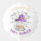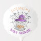 These charming balloons designed for a baby shower feature an endearing little ghost wearing a purple witch hat, joyfully displaying the word 'BOO.' The background is enhanced with an intricate spiderweb, complemented by whimsical bats, all of which contribute to a delightful and celebratory atmosphere perfect for honoring this memorable occasion.