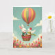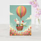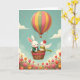 This design shows two friendly, human-like companions drifting upward in a large hot air balloon, their bodies angled toward each other as if sharing a private joke 🐰. The balloon fills the center with wide pastel stripes of pink, yellow, and soft green, and a small woven basket hangs beneath on thin lines. Inside the basket, a white rabbit in a green jacket and red bow tie stands close to a winged white creature wearing a green checkered scarf and a red flower, their gentle smiles and relaxed posture suggesting affection. The background is a powder-blue sky with rounded clouds and tiny heart shapes scattered lightly around them, adding a romantic touch without crowding the scene 🐇. Along the lower edge, a rolling band of stylized tulips and blossoms in coral, fuchsia, and warm orange spreads across the landscape like a soft garden carpet. The greeting text sits near the top in a light, airy color, with smaller matching words placed below the balloon so they don’t overlap the characters. The basket shows a tan woven texture with curved edges, while thin ropes lead up to the striped balloon above.