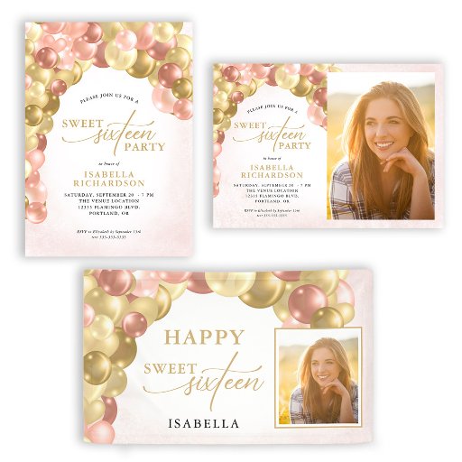 Balloon Arch Pink & Gold Photo Sweet 16 Party Invitation