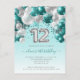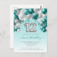 This festive girl's 12th birthday invitation postcard features a teal and silver balloon arch garland over a silver faux foil balloon number "12" and teal ribbon and confetti. Personalize the text with your child's name and birthday in elegant teal handwriting script and the other party details in gray sans serif font on a pale teal ombre background.