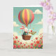 This design shows two friendly, human-like animals sharing a close moment in a hot air balloon, with the long-eared one in a green jacket and red bow tie leaning toward a fluffy white, bird-like companion with an orange bill. The bird wears a striped scarf in warm green and yellow tones, and a small red accent near its eye adds a flirty touch to their gentle, side-by-side pose 🐰. Above them, the balloon fills the upper area with wide vertical stripes of red, golden yellow, and deep olive, all tied to a woven basket that looks sturdy and detailed. Along the lower portion, a rolling field of red and pink poppy-like flowers is dotted with small yellow blooms, making the scene feel like a shared spring outing 🌷. The sky is a calm blue with soft light, and scattered white clouds drift behind the balloon to frame the pair’s quiet closeness. A short Easter greeting sits near the top in a light color, with a smaller line of text near the bottom in a matching tone for balance. Tiny golden stars are sprinkled around the clouds in the blue sky.