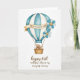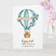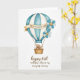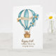 This greeting card features a watercolor-style hot air balloon centered on a bright white background, giving the scene lots of airy space. The balloon has soft vertical stripes in sky blue and creamy white, painted with light, translucent washes that feel gentle and romantic ❤️. A parchment-toned banner curves around the middle, carrying a short message in dark lettering that stands out without feeling harsh. Small blossoms decorate one side, with muted blue and white petals and sunny yellow centers that add a sweet, friendly touch 🌼. Below, thin golden cords hold a woven basket in warm earthy browns, grounding the light colors above. Inside the basket, two plush toy-like figures sit close together, their heads tipped toward each other as if sharing a quiet, affectionate moment. Near the bottom, a sepia-toned line of text sits as a lower caption, balancing the design beneath the balloon. The banner wraps across the balloon’s center while the lower caption rests beneath the basket in rich brown ink.