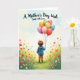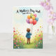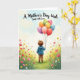 This design shows a small child seen from behind, standing quietly in a green meadow as if watching a sweet surprise drift upward ❤️. The child wears a blue top with earthy brown trousers, and their slightly tilted head suggests a tender, affectionate moment, like a gentle offering sent into the sky. Around their feet, wildflowers scatter across the field in pink, red, yellow, and white, with thin green stems and soft, painted textures. Above, a bunch of balloons rises in purple, orange, green, red, and blue, adding a light, friendly energy to the scene 🌼. The background is a soft blue sky with pale, airy clouds that stretch across the upper half of the card. Near the top, a short greeting appears in flowing dark lettering, centered and floating above the balloons without covering the main image. The balloons cluster just right of center, with curling strings trailing down toward the child’s hands and the flower-dotted grass.