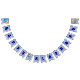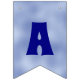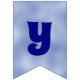 This happy birthday bunting flags have blue letters to spelling out the birthday greeting. Three balloons are on each of the flags that don't have letters. The bunch of balloons features a red balloon, a yellow balloon, and a blue balloon.
