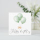 Pretty mint green balloons tied with a golden bow float above an elegant calligraphy 'Happy birthday' script. Embellished with a decorative heart flourish on the letter h and letter p.