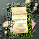 Elegant gold swirls, balloons, wine glasses, gold glitter high heels on green background.
