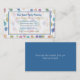 Here's a fun business card that event and party planners will like. The background is a pattern of blue, gold, green, and pink balloons floating on a white background. A semi-transparent white center rectangle holds your business information in blue and gold. The back of the card is solid matching blue with an extra text field in white if you need it.