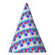 Balloons with Stars Kids Birthday Party Party Hat with Name. Birthday party hat for children. Perfect for a boy or a girl who is celebrating the birthday. Three balloons in red, purple and pink colors with stars on a blue background.